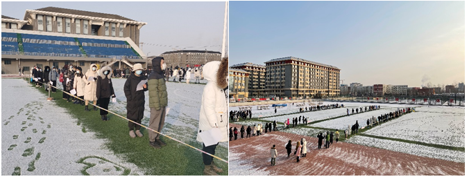 1月19日上午8点,yl6809永利线路检测第三附属医院的医护人员进驻良乡校区,在体育场冒着今年第一场初雪,完成了该校区共计1269名学生的核酸检测工作。检测现场,学工部、保卫处、后勤处及各学院相互配合,保卫处的安保队员还拿起扫把帮助清扫场地,顷刻间清理出了学生室外集合与排队通道。工作人员引导学生依次前往检测点排队登记、检测,做到了无遗漏、有秩序;检测学生服从安排、听从指挥、主动配合,所有同学自觉间隔一米排队、全程佩戴口罩;医护人员录入信息、咽拭子采样。整个检测取样过程快捷高效、井然有序、效果良好。