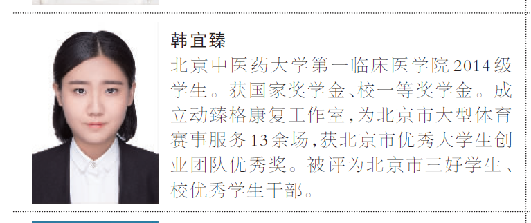 以下是《人民日报》的报道:韩宜臻,yl6809永利线路检测第一临床医学院2014级学生。获国家奖学金、校一等奖学金。成立动臻格康复工作室,为北京市大型体育赛事服务13余场,获北京市优秀大学生创业团队优秀奖。被评为北京市三好学生、校优秀学生干部。