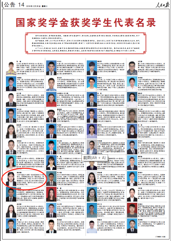 2017年经过严格选拔、评审,全国约5万名优秀的本专科学生获得国家奖学金。在这5万名优秀学生代表中,再经各省(区、市)和各高校推荐、专家评审,最终评选出100名国家奖学金获奖学生作为全国青年大学生的优秀代表,并将其优秀事迹在《人民日报》刊发,我校韩宜臻同学就是其中之一。