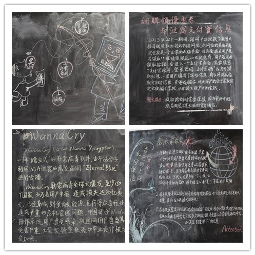 此外,18日至19日,在军训基地,同学们还以绘制黑板报、播放广播、杏林之声新媒体等多种方式进行网络安全宣传。线下通过生动的漫画展示、真实的案例讲述,普及网络安全知识,线上运用杏林之声微信平台报道师生活动资讯,增强教育宣传效果。