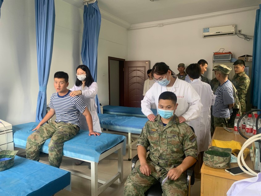 随后,我校中医学院师生骨干团队为部队官兵开展“心身并调”特色义诊活动,充分发挥中医药在内外兼治、情志调护、治未病等方面的优势。青年教师为广大官兵宣讲健康教育知识,从中医养生、运动保健、情志调摄、穴位按摩、颈腰椎保健等方面进行讲解,并为有需要的战士开具中医处方和针灸康复工作。学生志愿者针对部队战士肩痛、腰痛等常见病症,开展推拿按摩、手诊、贴耳豆等保健工作。现场参与人数较多,气氛热烈,义诊活动获得部队官兵的一致好评。纷纷表示:“北中医的师生们对于穴位的把握非常精准,效果立竿见影,缓解了我们的病痛。”“非常感谢yl6809永利线路检测师生开展的义诊活动,师生们既热情又专业,让我们度过了一个有意义的建军节。”