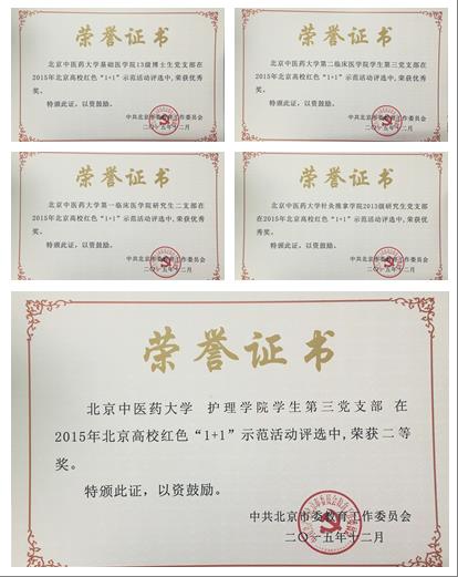 护理学院学生第三党支部荣获“2015年北京高校红色“1+1”示范活动”二等奖;同时我校基础医学院13级博士生党支部、第二临床医学院学生第三党支部、第一临床医学院研究生二支部、针灸推拿学院2013级研究生党支部获得优秀奖。