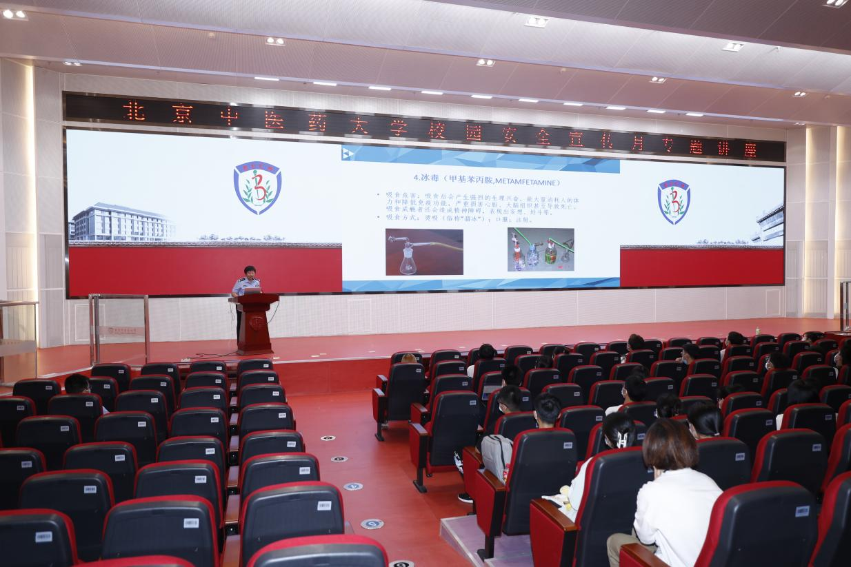 禁毒总队宣教大队副大队长刘英茹,围绕毒品的危害、怎样预防毒品犯罪、如何识破毒品陷阱、如何防范新型毒品以及《北京市禁毒条例》等法律法规,向同学们宣传普及毒品相关知识,告诫同学们要遵守禁毒法律法规,进一步树立自我保护意识。刘队长与现场观众进行互动,调动同学们的积极性,让同学们在轻松而活跃的氛围中,深入了解了禁毒相关知识。她现场展示的禁毒危害人的生理、心里健康,破坏幸福生活的活生生的案例和一张张照片,让自觉远离毒品、谨慎交友、养成健康的生活习惯、坚决拒绝毒品等理念深深印在了同学们的心里。
