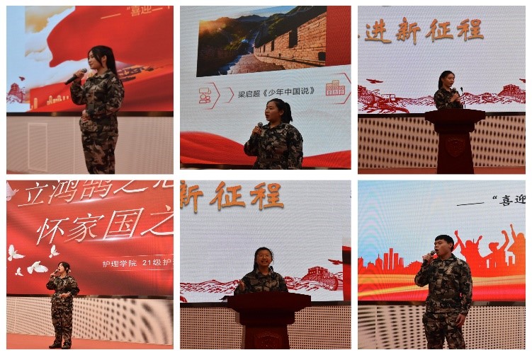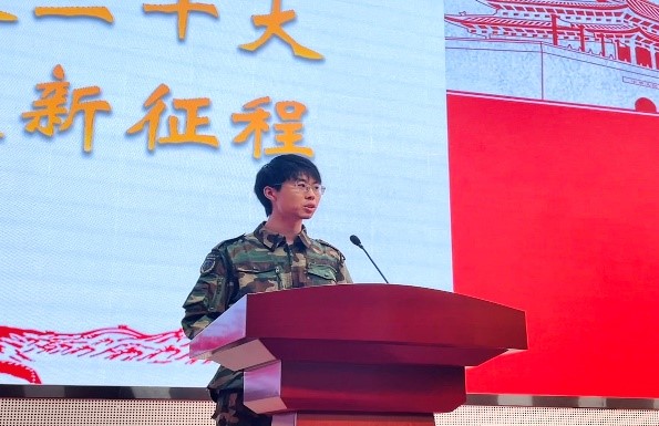 比赛中,八个连队的参赛选手以“喜迎二十大,奋进新征程”为主题开展演讲。他们慷慨激昂、娓娓道来,用质朴的语言讲述着从晨光熹微到月明星稀的故事,展现了坚韧顽强、自强不息的军训精神,表达了在壶天燕地突破成长和对党的二十大胜利召开的热切期盼。受防疫影响,两位演讲学生在线上表达着自己对军训生活的不舍之情。