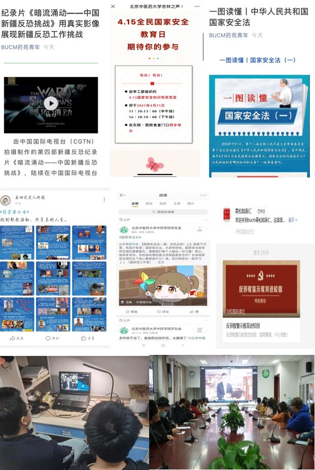 线上学习,积极组织开展国家安全教育线上学习。各学院组织学生共同观看以“千万师生同上一堂国家安全教育课”为主题的公开课,开展“全国高校学生国家知识线上竞答”活动、微博#国家安全日#话题互动活动,并通过官方公众号、官方微博账号等渠道发布国家总体安全观、反恐、反邪教相关的宣传文章,督促学生关注“中国反邪教”微信公众号,以新媒体宣传手段,开展国家安全宣传教育,引导学生牢固树立国家安全底线思维,进一步加深学生的反恐意识,提高学生的防邪教能力,营造了维护国家安全的浓厚氛围。